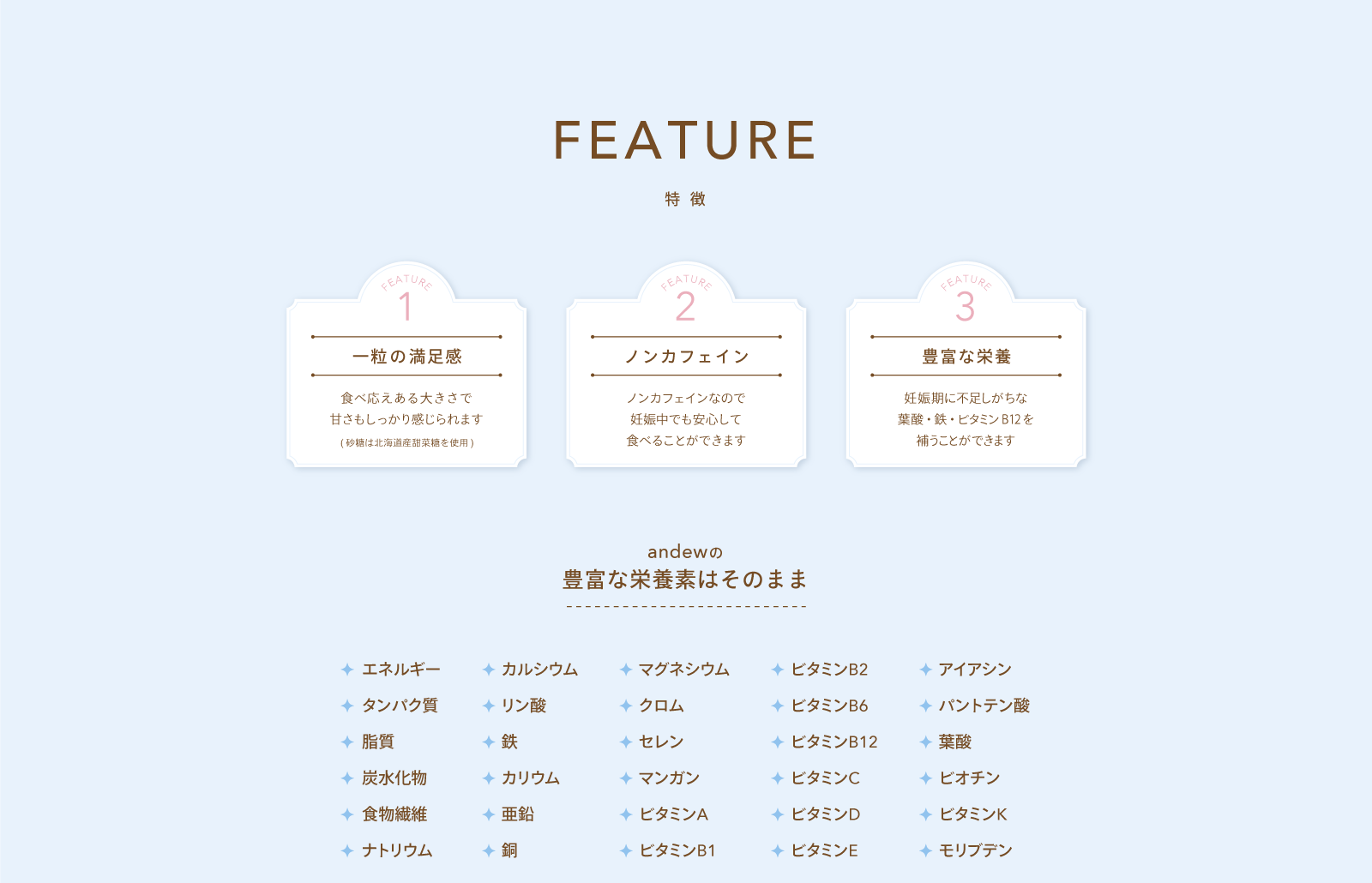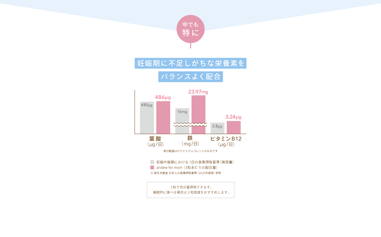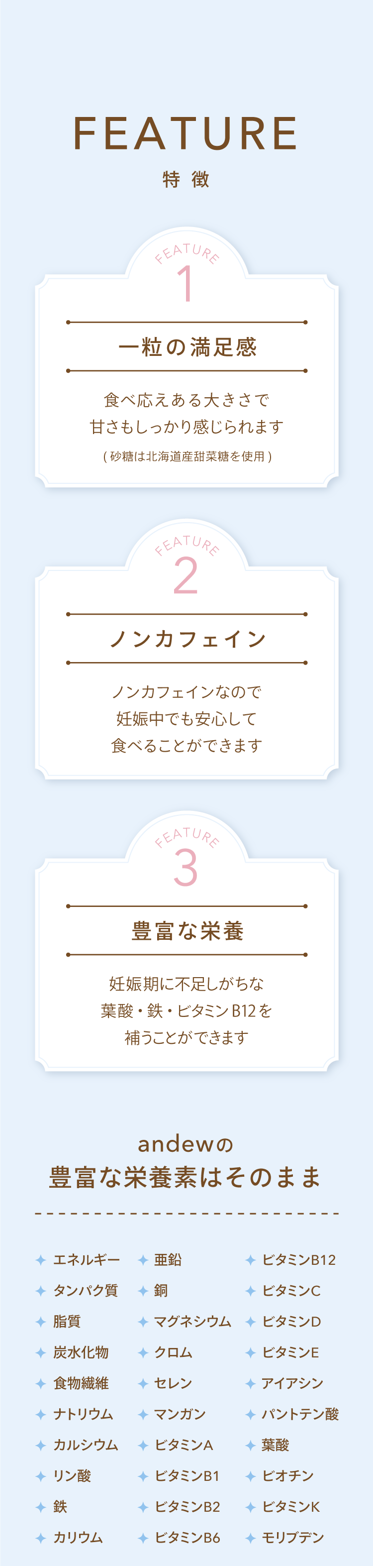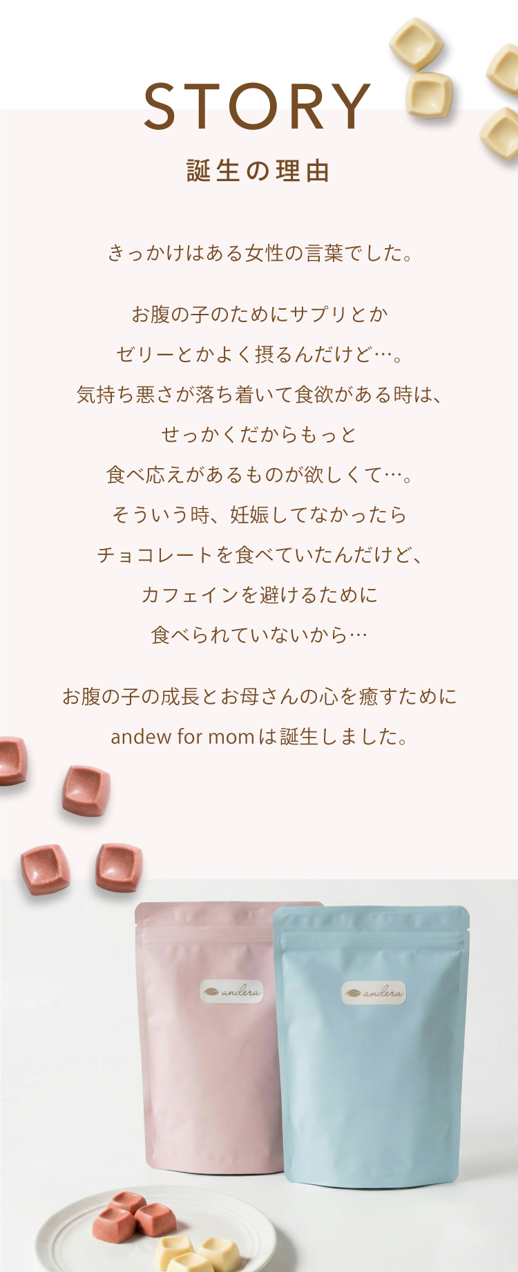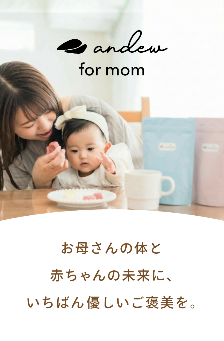 妊娠中、思うように食事がとれない日も、 自分の体より赤ちゃんの栄養を優先してしまう夜も。 andew for momは、お母さんの切実な想いに応えます。