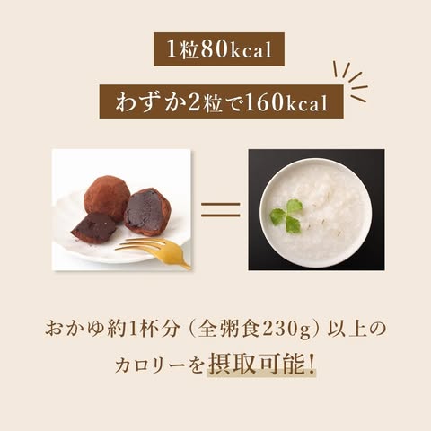 エネルギー補給にぴったり。わずか2粒で約160kcal (おかゆ1杯半分)